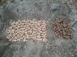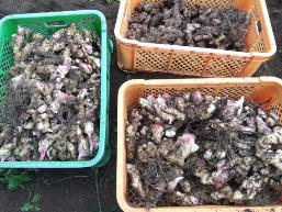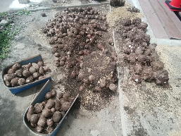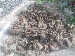 里芋の収穫写真を撮るのを、すっかり忘れてた。左、中、生姜を収穫。大豊作。佃煮、甘酢漬け、砂糖漬けと大活躍。右、牛蒡を収穫。枝分かれ(やじゃ)が多い。