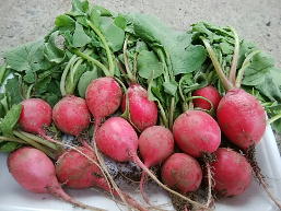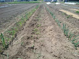 畑の野菜達を一挙に紹介。左、ネギの定植をする。中、春大根が発芽。右、二十日大根も芽が出た。