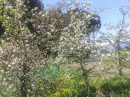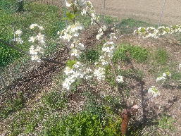果樹園は花盛り。左、リンゴ3種。中、去年新しく植えたプルーン。右、ブルーベリーはなかなか大きくならないなあ。