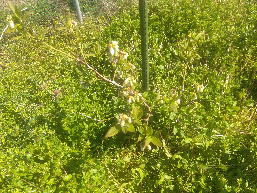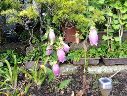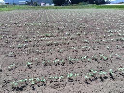 左、ツリガネソウはもしゃもしゃになって、花芽が上がるのを待つ。中、チンゲンサイ、水菜、からしなの発芽。右、キャベツは根付いて大きくなり始める。