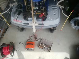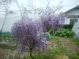 田植えの準備も本格的。左、田植機のオイル交換。中、バッテリーの充電も。右、自宅の花も満開。藤の花。