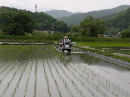 左、イチゴも少しずつ大きくなってる。右、今日は田植え。小学生になった孫と、田植え機ドライブ。