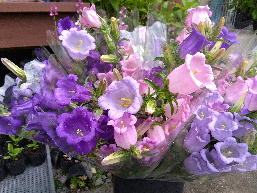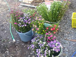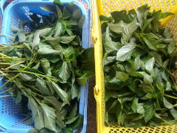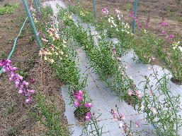 左、遅れていて気を揉んでいたが、どうにかお盆に間に合ったアスター。右、モロヘイヤも初出荷。