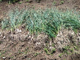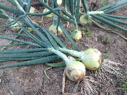 左、マルメロが大きくなってきた。この後摘果。中、玉ネギを全部引っこ抜く。右、ラッキョウも引っこ抜く。