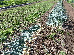 左、二日がかりで小梅を選別、出荷。全部で54kg。中、かわいらしい姫金魚草が咲き始めた。どうやって売ろうか。右、玉ネギを試し採り。今年は良さそう。