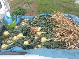 左、ニンニクも引っこ抜く。中、リンゴも大きくなってきた。この後摘果。右、結局玉ネギ、ニンニク、ラッキョウで軽トラ一杯。