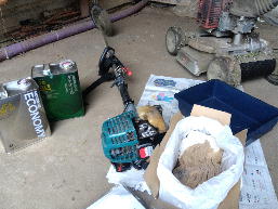左、牛蒡の畝作り。クレバーシートを敷設したところ。右、4サイクルの草刈り機のオイル交換。