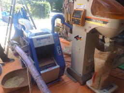 臼挽き(籾摺り)を行う。今年は史上最高採れ高。後日談、心配してたが今年は全品一等米だった。ホッ!